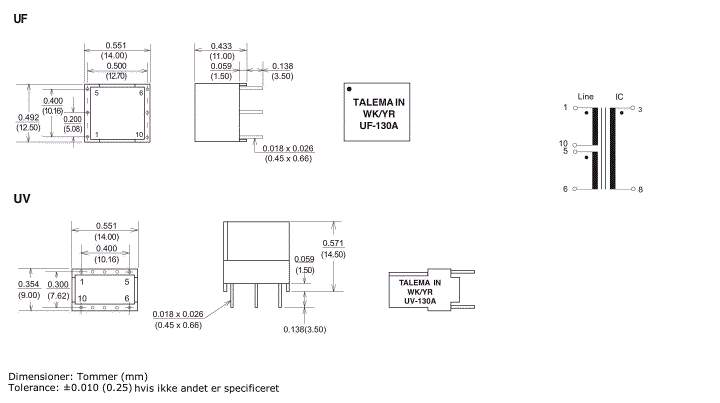 Line side viklinger i serie, IC side viklinger kortsluttede - målt ved 100kHz, 100mVrms |